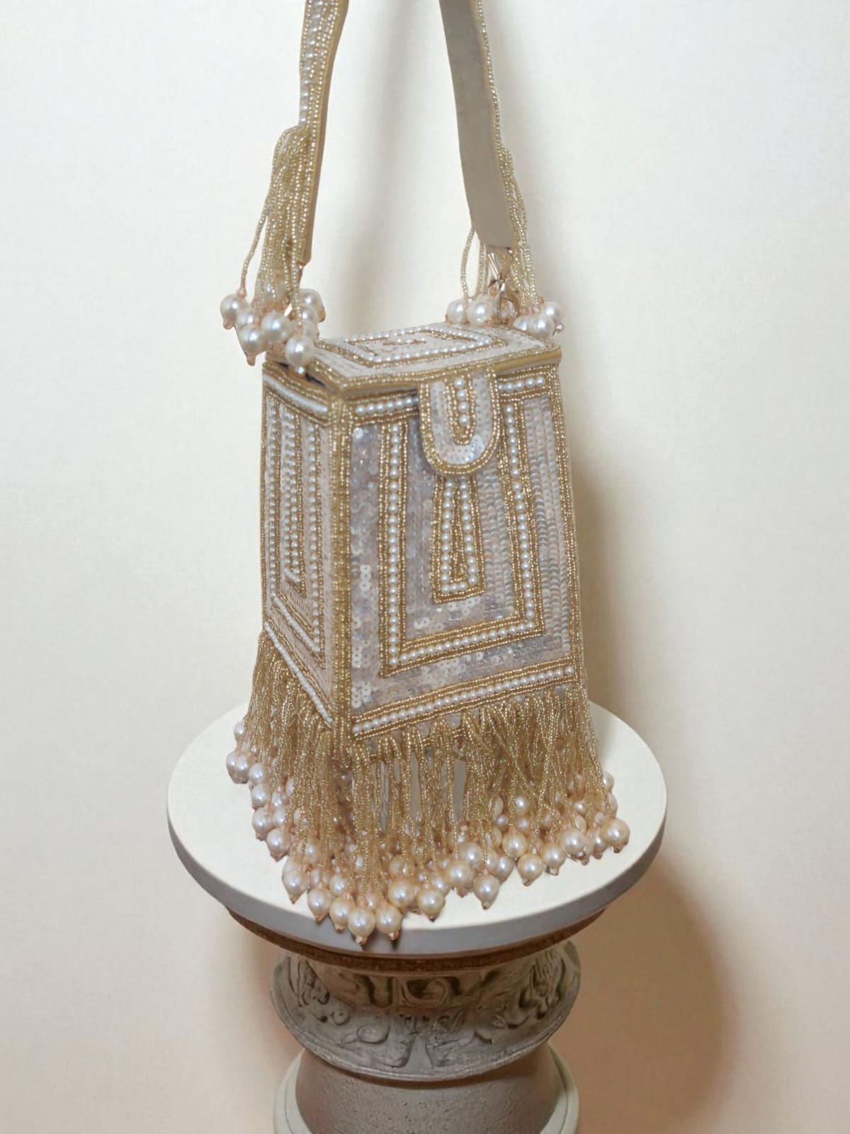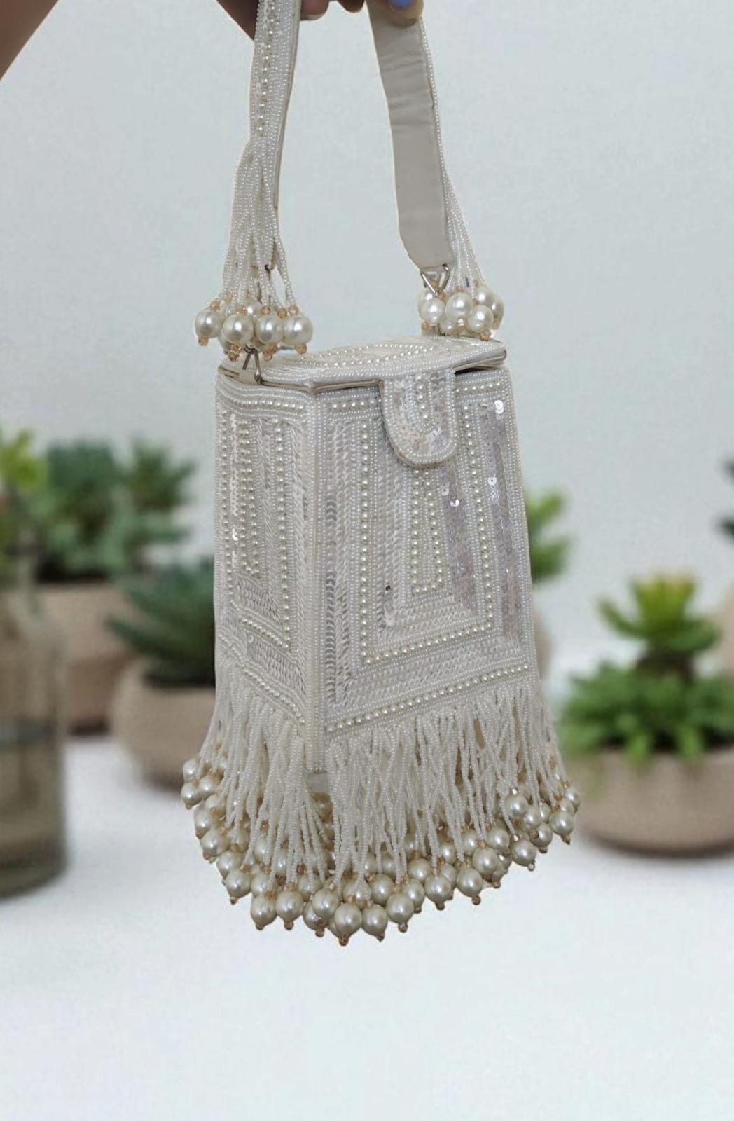 Shine bright at every celebration with this Silver Beaded Box Clutch, exquisitely handcrafted with intricate beadwork and shimmering sequins. The structured design is enhanced with long fringe detailing and beaded tassels, adding a luxurious and glamorous flair. Its sturdy shape and beaded handle make it both stylish and practical, ensuring you stand out at weddings, parties, and festive gatherings.