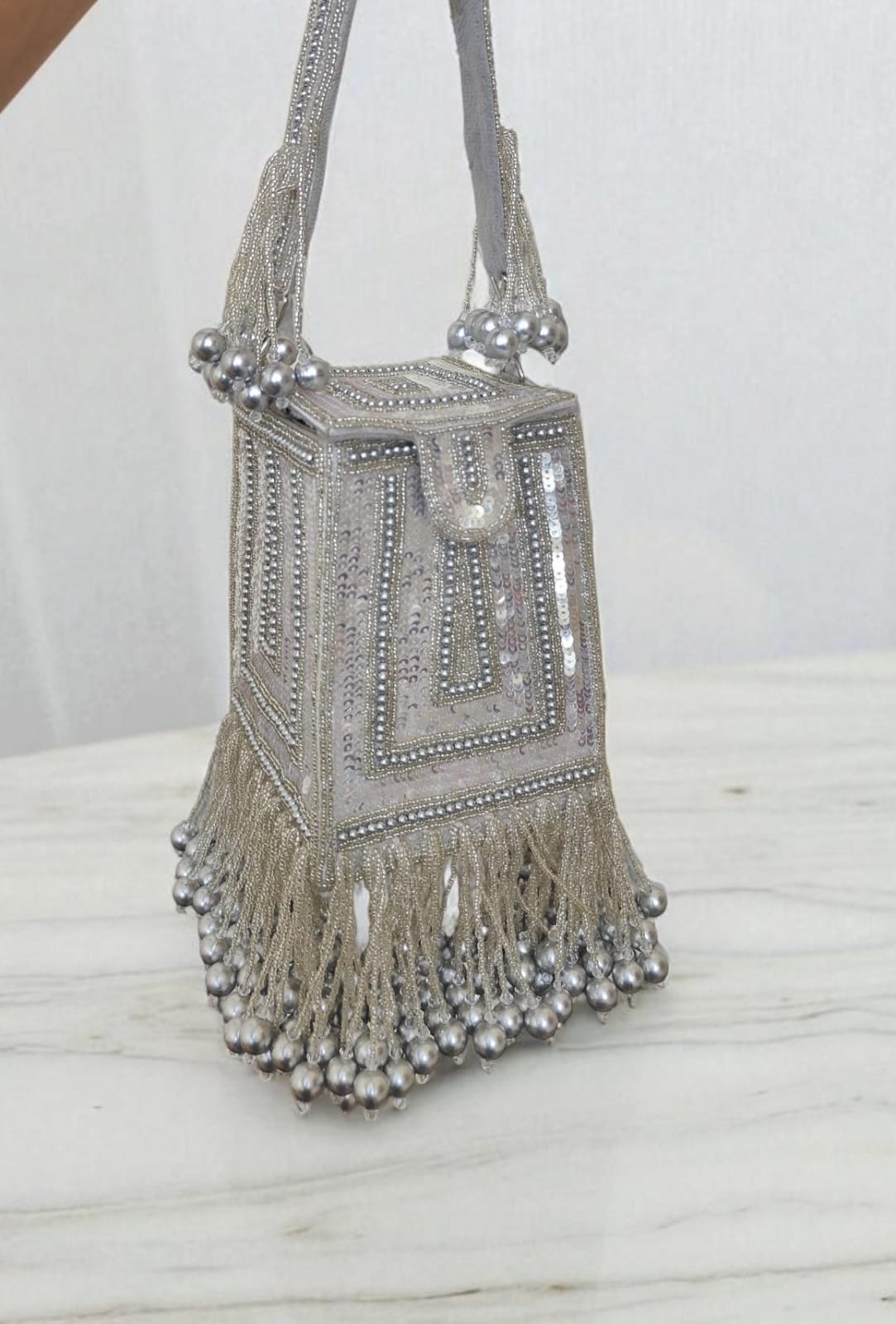 Be the first to review “Silver Beaded Box Clutch with Fringe Detailing – Party & Wedding Handbag”